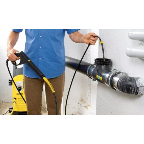 Шланг для прочищення труб від Karher Дозволяє прочищати труби і стоки, що засмітилися довжиною до 13м за умови вільного доступу з обох боків. Чотири спрямовані назад струмені високого тиску забезпечують просування шлангу по трубі і видалення бруду. Високоякісний гнучкий шланг оснащений відмітками і маркерним кільцем, що дозволяє відстежувати просування по трубі. Шланг армований текстильної опліткою, захищений від перегину, забезпечений дуже коротким латунним соплом для максимальної рухливості і довговічним латунним роз'ємом. Комплект для побутових апаратів високого тиску Kärcher може застосовуватися всередині будинку і на відкритому повітрі.