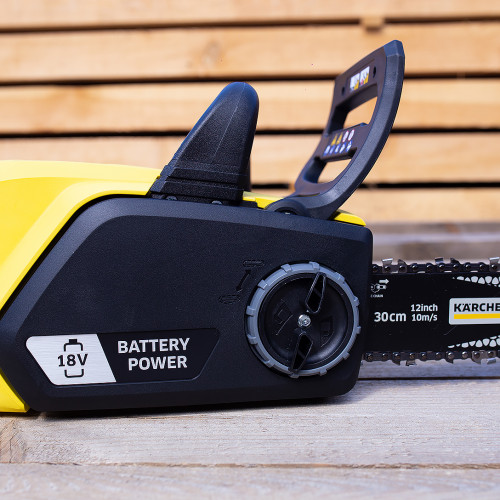 Невелика акумуляторна пила Karcher CNS 18-30 з батареєю на 18 В з легкістю впорається з побутовими потребами заміського ділянки або приватного будинку.